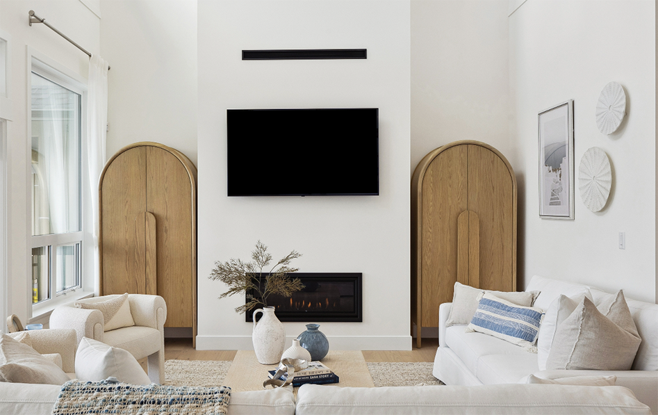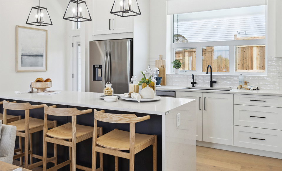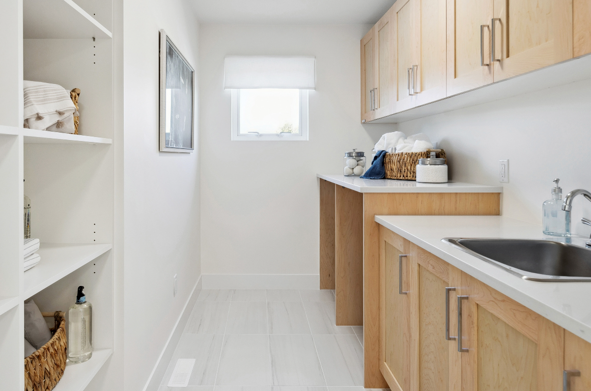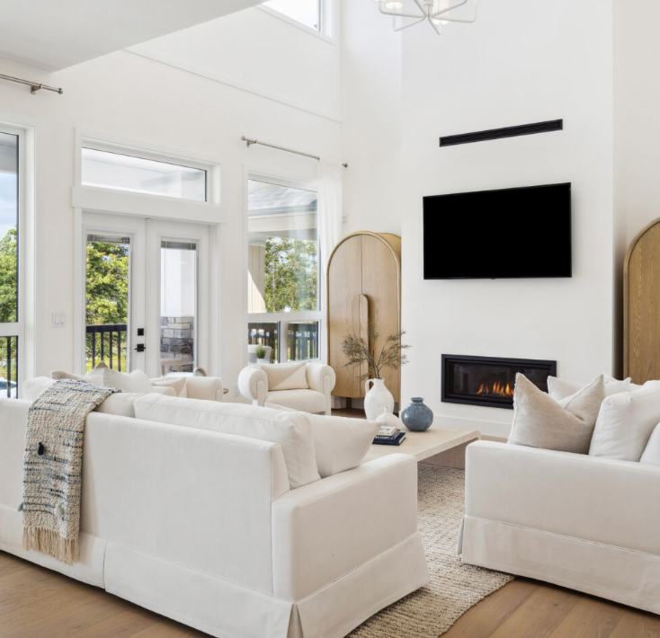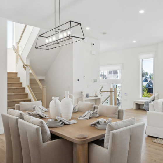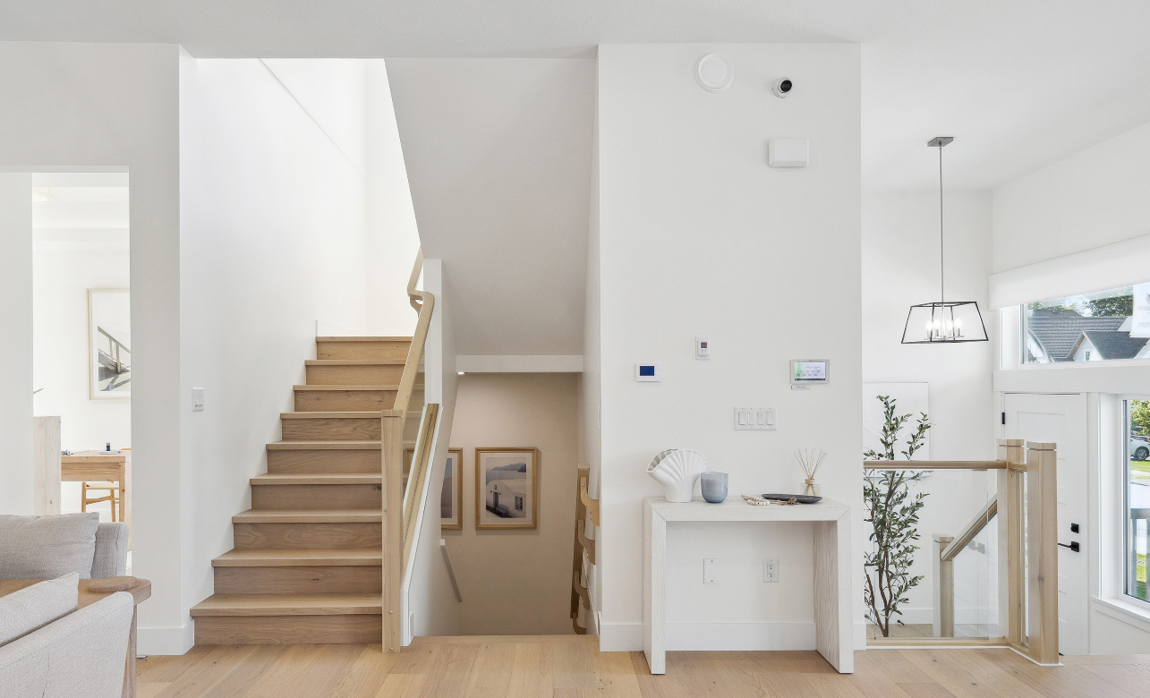 High-efficiency systems include natural gas forced-air heating, heat recovery ventilators, tankless hot water, and triple-glazed windows. Finishes lean contemporary: soft-close shaker cabinetry, quartz counters, full-height ceramic tile backsplashes, and integrated tech ready details (WiFi thermostat, USB ports, smart panels) are standard.